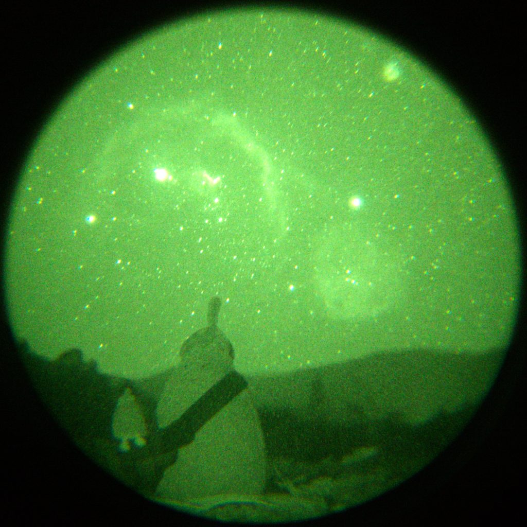 这里我发现夜视仪的目镜会反射出环境的贼光,迫不得已我紧急用围巾把相机镜头和目镜之间包起来了。
